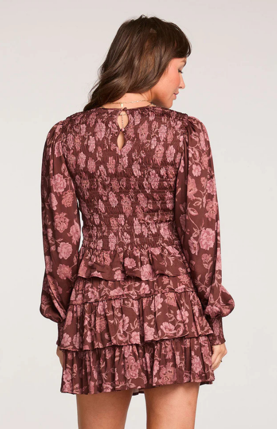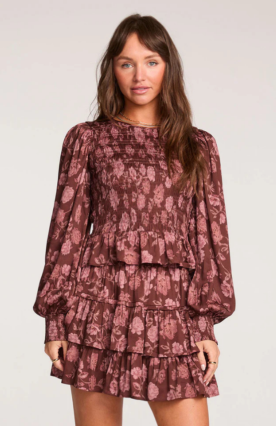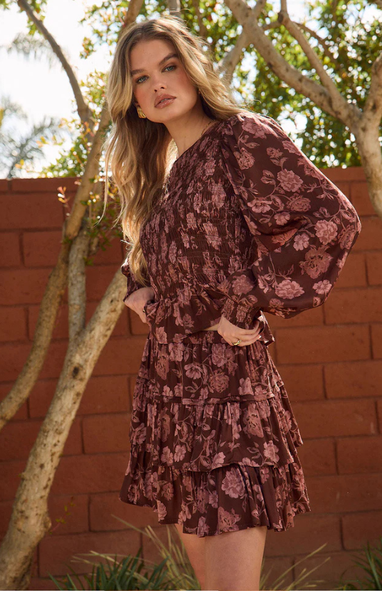 Its dramatic gigot sleeves add a touch of vintage romance, enhanced by a soft pink botanical pattern.