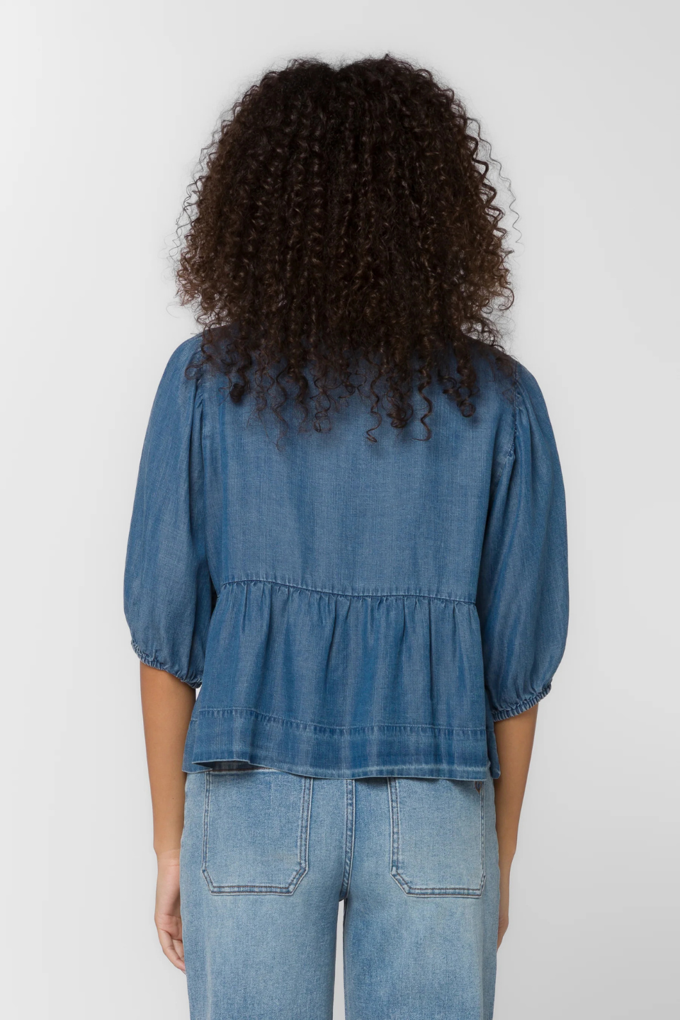 This puff sleeve peplum top features a triple bow front tie, soft flowy drape and is smooth to the touch.