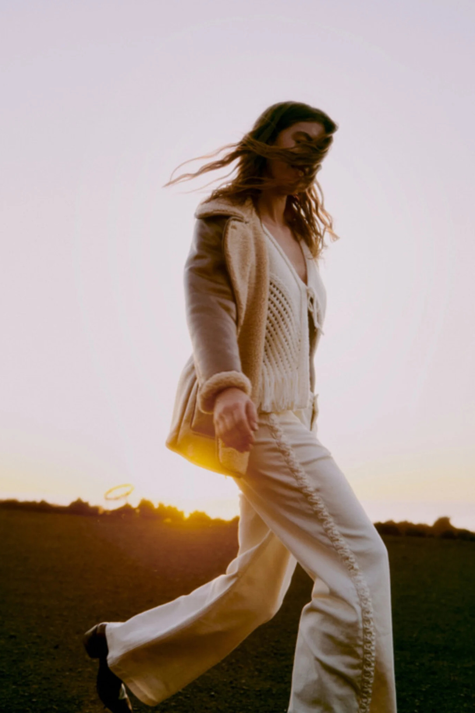 Crocheted tie-front cardigan with delicate fringe detailing. Featuring a flowing fit and an elegant front bow, this piece combines soft femininity with a touch of bohemian charm. The openwork design and fringe hem add texture and movement, making it a versatile layer over dresses, tanks, or tees—from day to night.