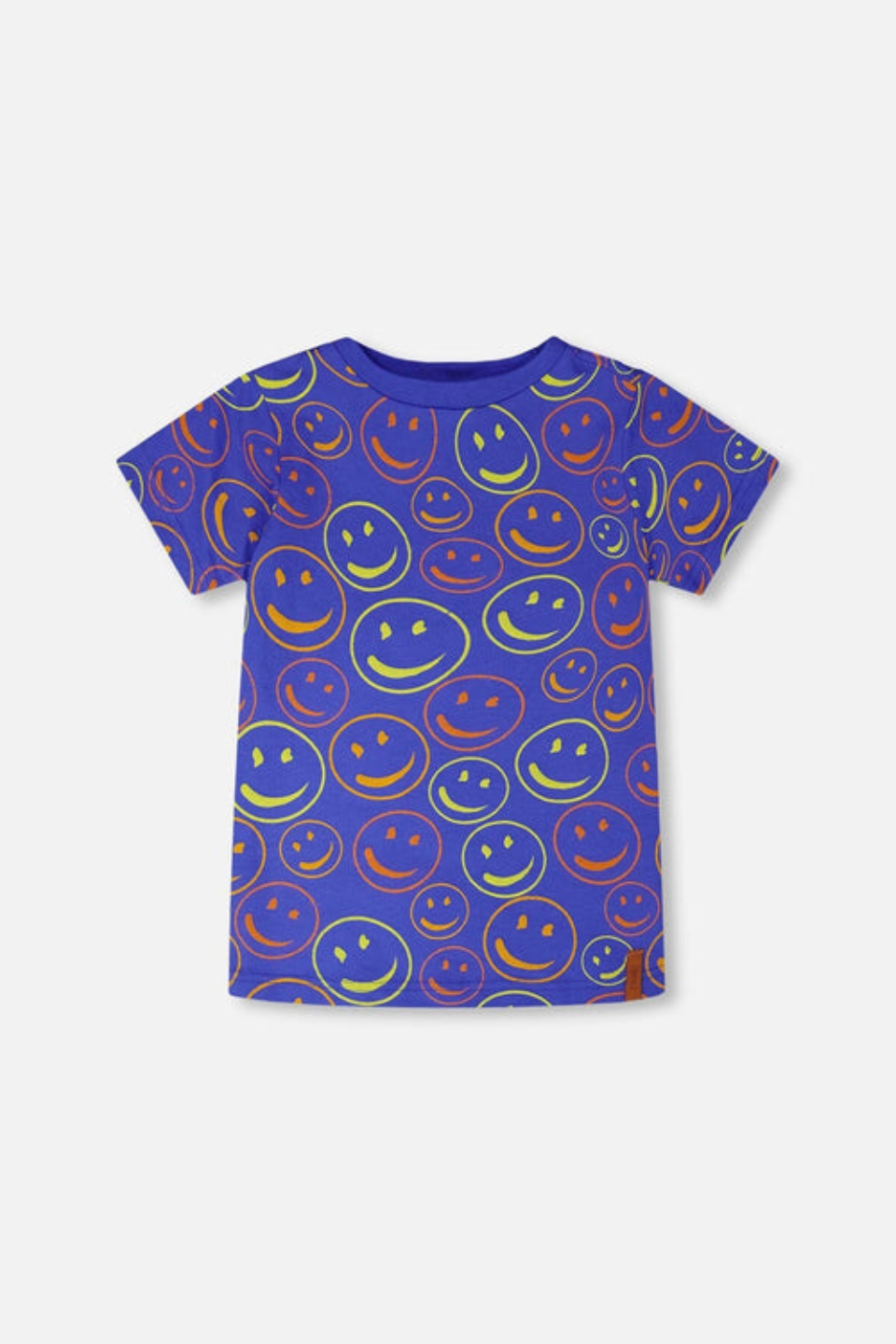 The organic cotton jersey t-shirt in blue with printed smileys is both playful and stylish for boys. This short-sleeve tee features an allover print of cool smiley faces scattered across a blue background, giving it a trendy happy vibe. Made from a soft blend of cotton, polyester, and elastane, it combines comfort, stretch, and durability for everyday wear.