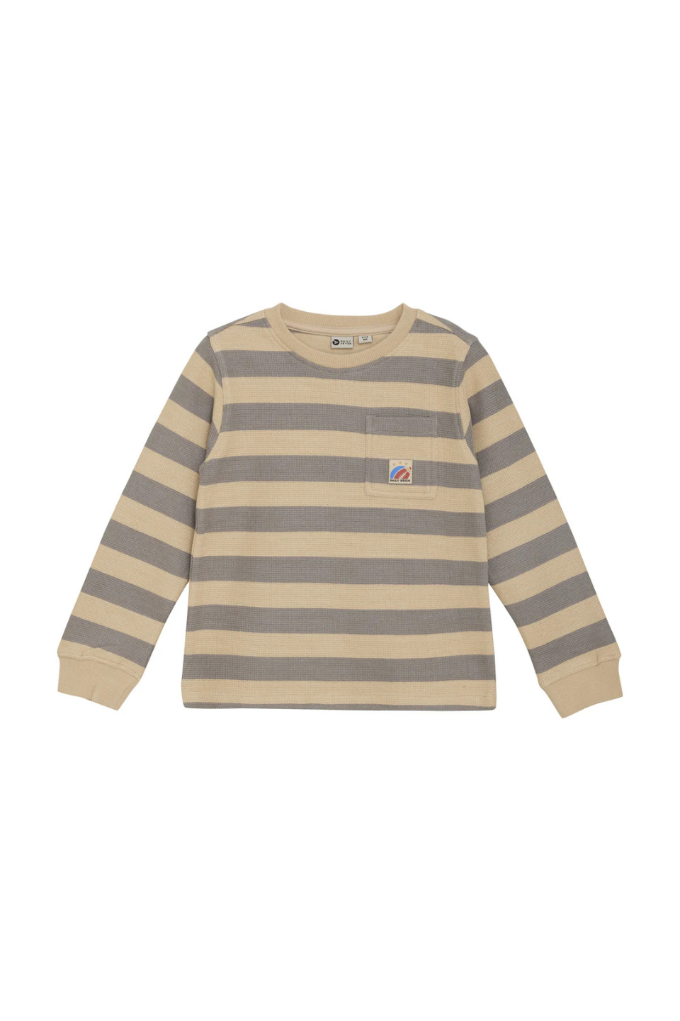 Cool long-sleeved t-shirt in 100% cotton from Daily 7 Kids. The shirt has a large striped all-over print, and a front pocket on the chest with a retro logo from Daily7Kids.