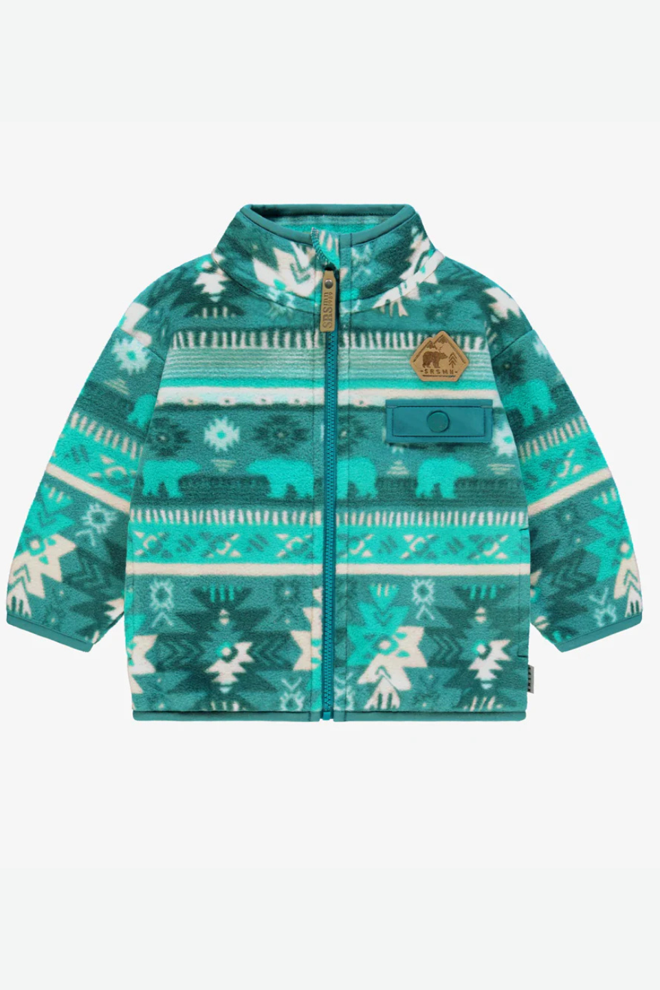 Turquoise fleece jacket, perfect for colder days. Equipped with a zipper with chin guard for easy dressing.