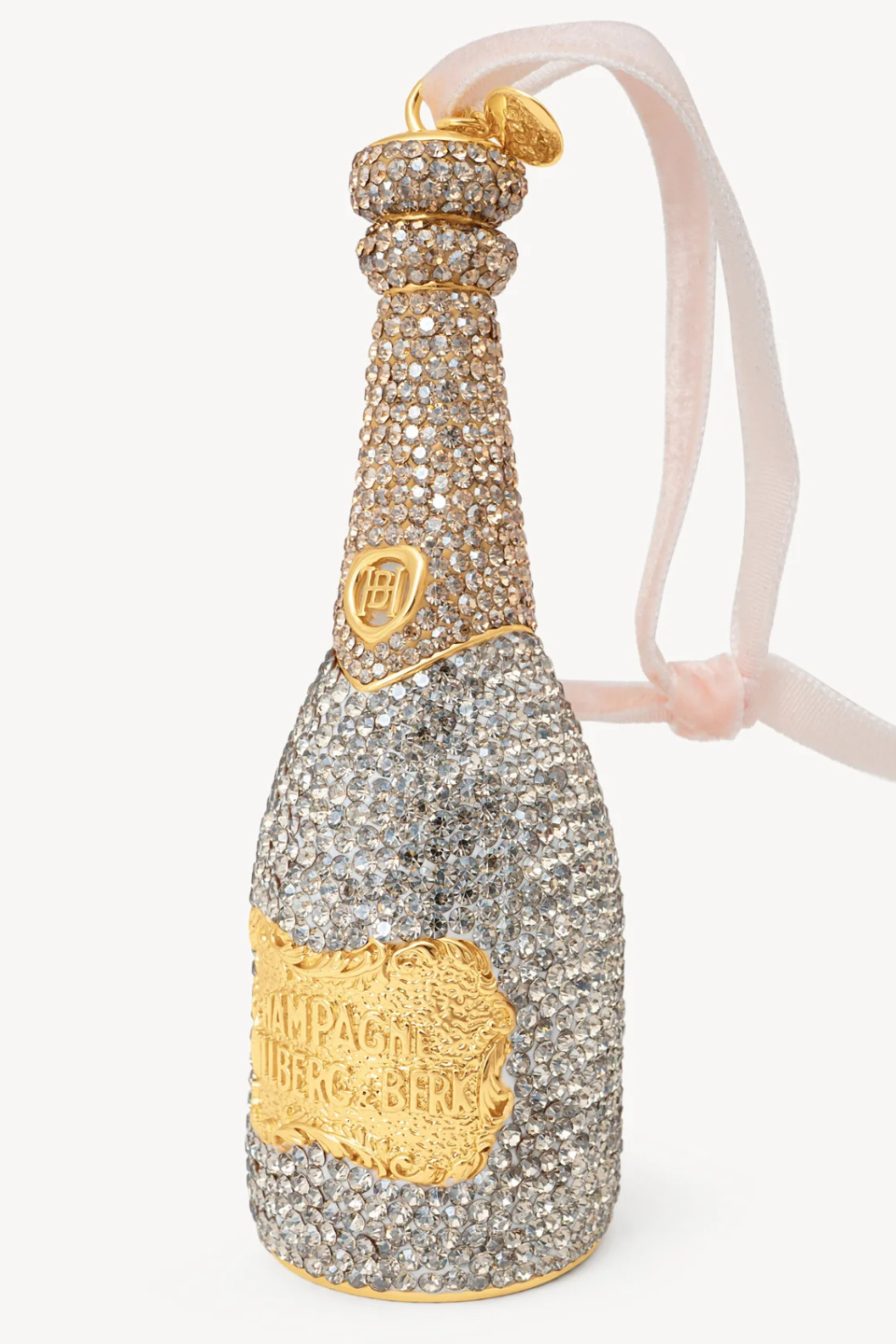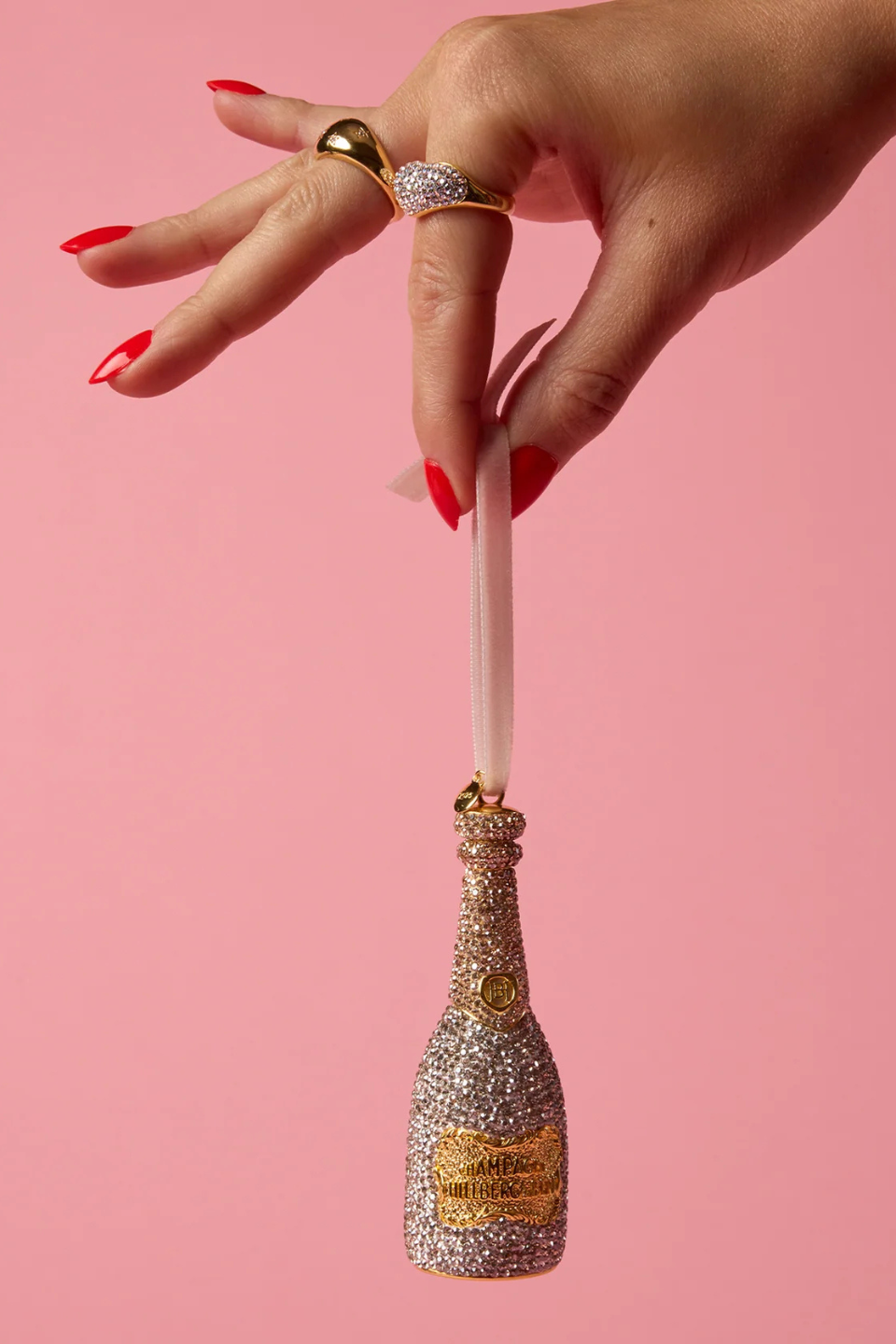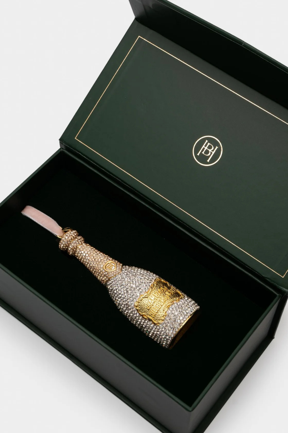 For the woman who makes every moment worth toasting. The Cheers Ornament turns a classic champagne bottle into a symbol of celebration, crafted with hand-set crystals that shimmer in gold and silver. Made with 14k gold-plated brass for strength and shine, it’s finished with a soft pink velvet ribbon and packaged in a custom velvet box for gifting or safekeeping. Whether it’s hung on your tree or displayed all year long, this keepsake is a joyful nod to life’s sparkling moments.