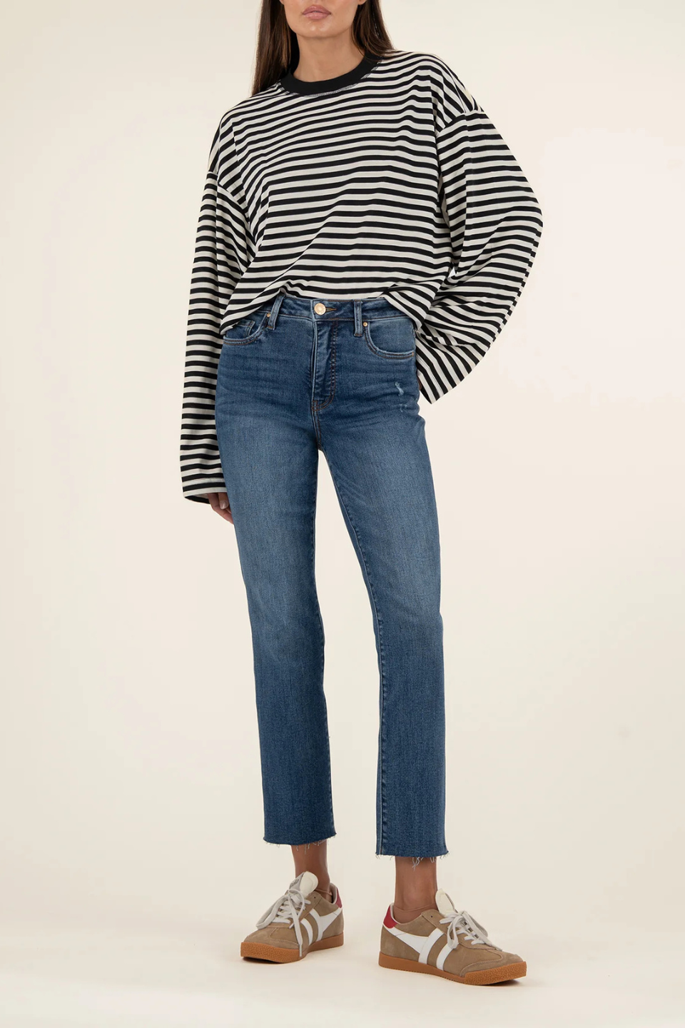 - Step into effortless cool with these high-rise ankle straight jeans in a versatile medium wash. Featuring Fab Ab for a flattering fit, a trendy raw hem, and a touch of distressing, they’re made from stretchy material for comfortable all-day wear. Perfect for casual looks with an edge.