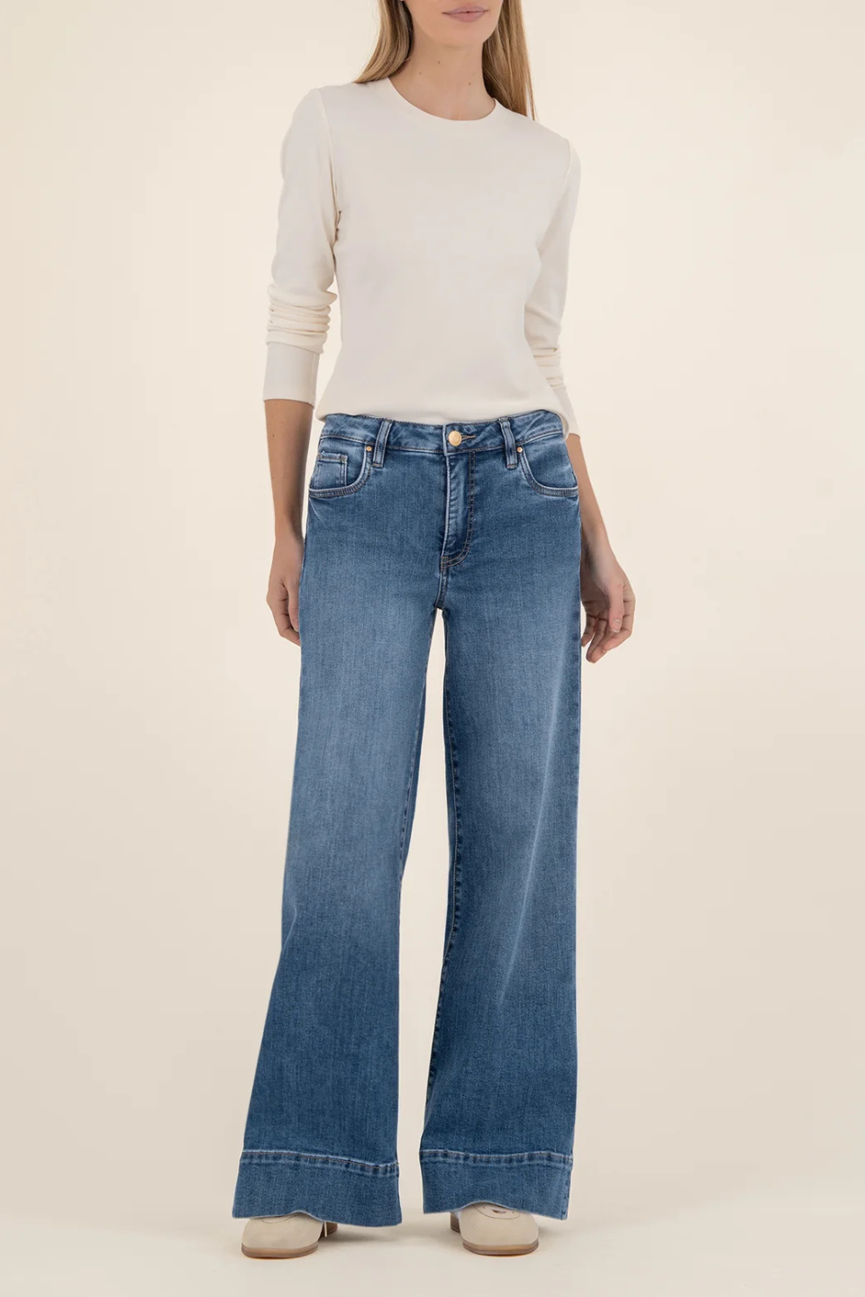 These high-rise wide leg jeans strike the perfect balance between structure and comfort. Designed in a classic medium wash with a bold wide hem, they bring an effortlessly polished feel to any look. Fab Ab pockets offer subtle shaping, while the stretchy material keeps the fit easy and flattering all day long.