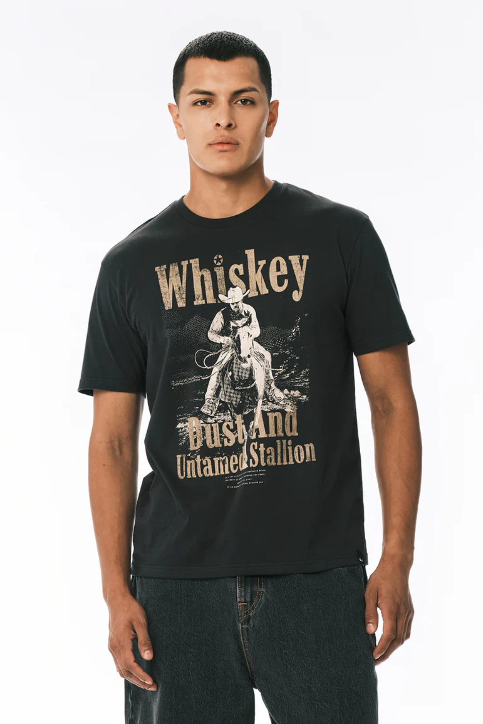 Tafo men’s graphic crew neck t-shirt features a bold cowboy and horse print with vintage-style “Whiskey, Dust and Untamed Stallion” lettering. Made from soft cotton with a classic short sleeve fit, it delivers casual comfort with a rugged Western edge.