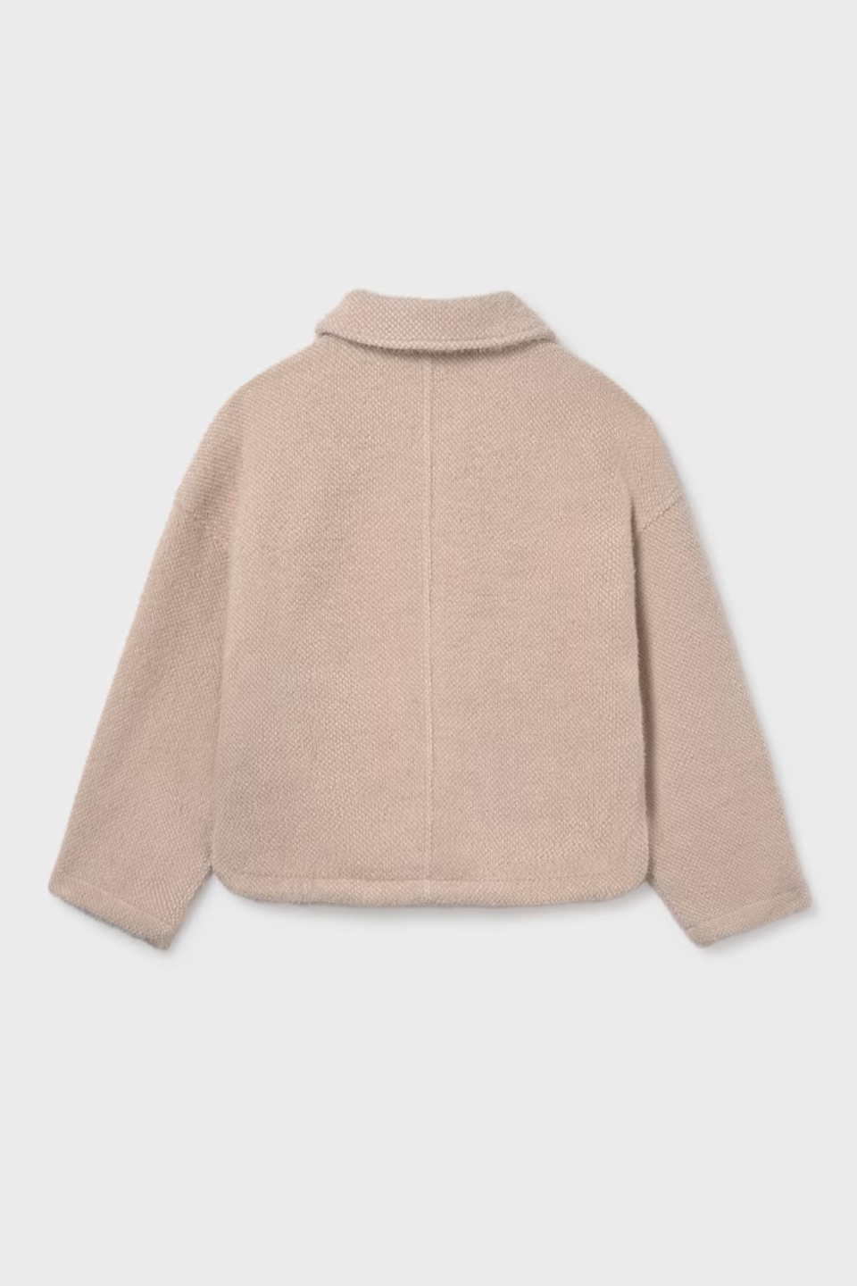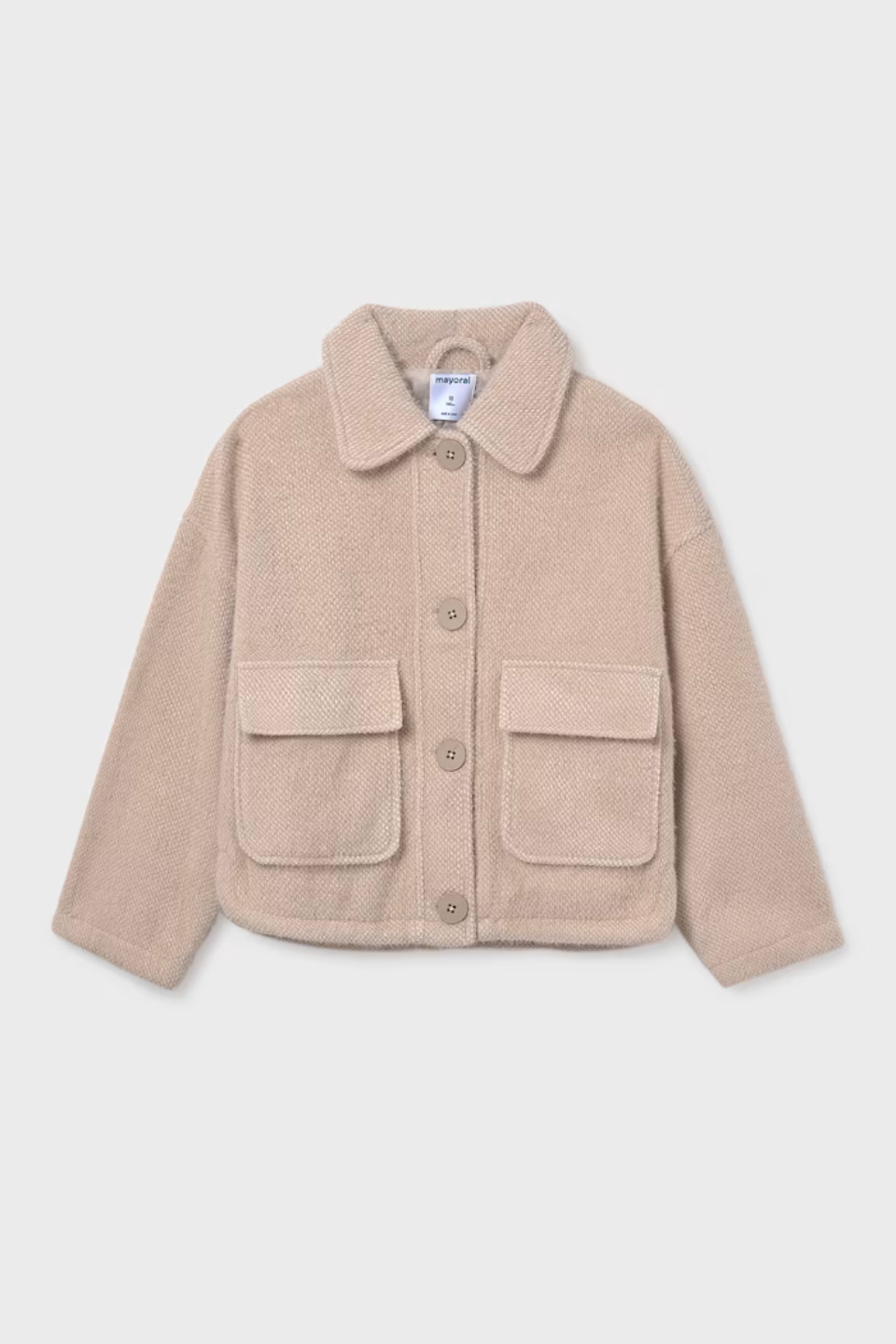 Long sleeved Coat for girls. Button fastenings down the front. Soft polyester inner lining. Front pockets. Decorative elements: faux fur appliques.