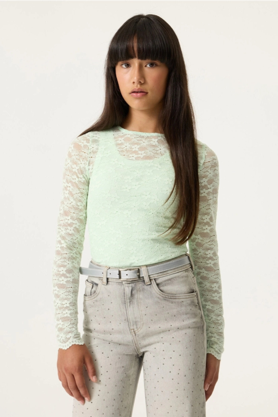 Long sleeve with an elegant lace finish. This long sleeve has a round neck, long sleeves, and a slim fit. This item is made of 90% polyamide and 10% elastane.